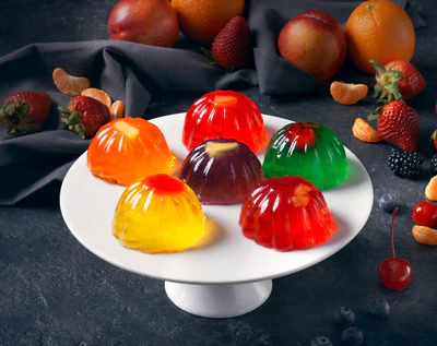 Gelatina de un solo sabor fresa, uva, mora azul, limón, piña y naranja.