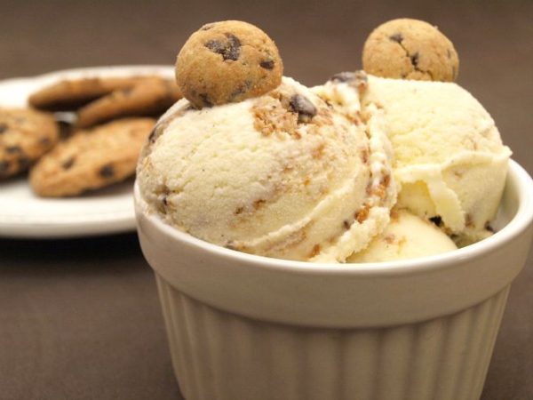 Helado de vainilla echo con Leche Entera Nata, Leche en Polvo, Azúca, Dextrosa , Neutro para cremas ,Vainilla natural en rama y con trocitos de cookie y base de chocolate decorado con pepitas de chocolate.